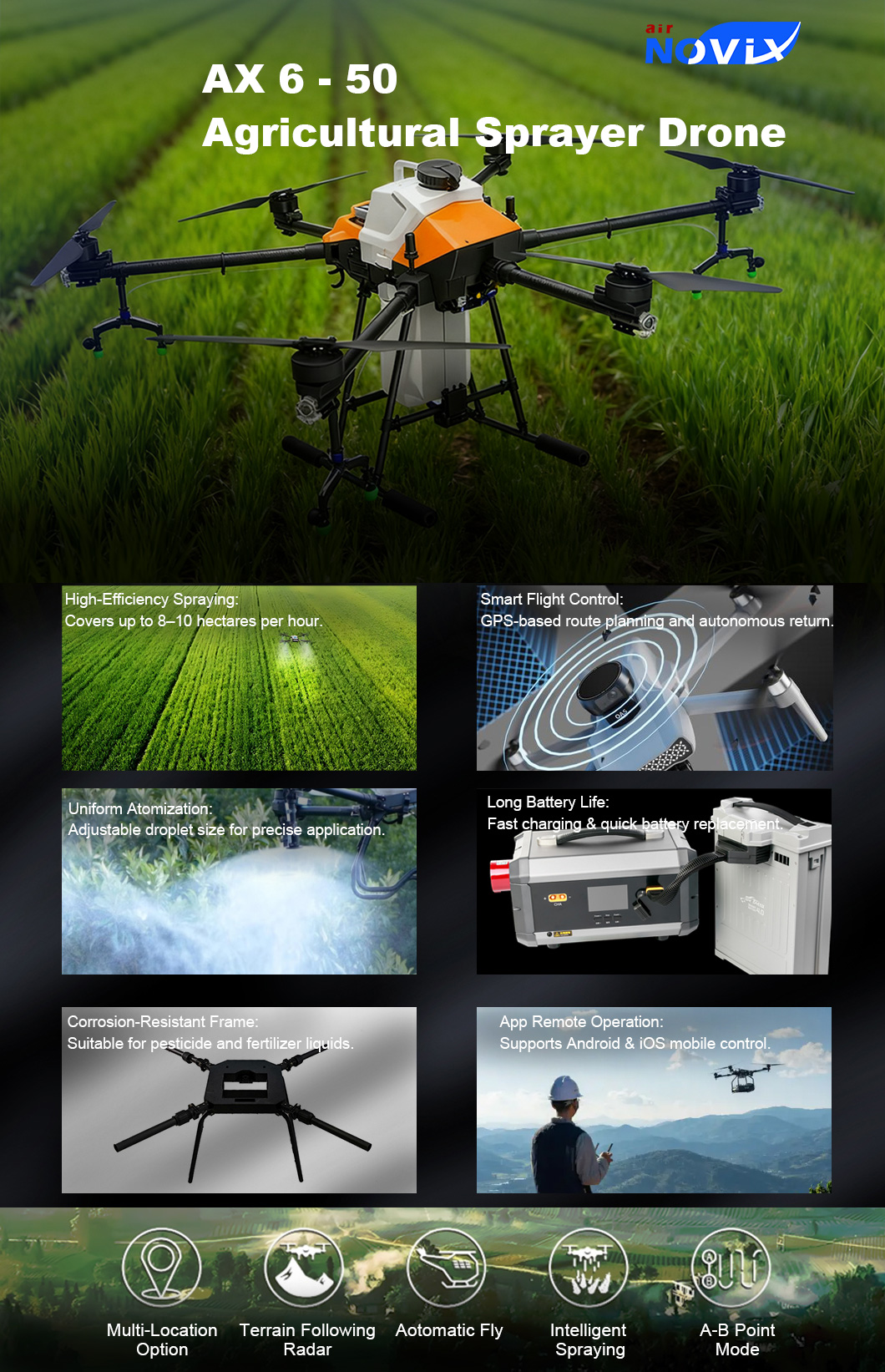 The AirNovix 50L drone is designed with a 50-liter spray tank capacity, allowing efficient spraying across large-scale farmland such as rice, corn, wheat, cotton, and orchards.